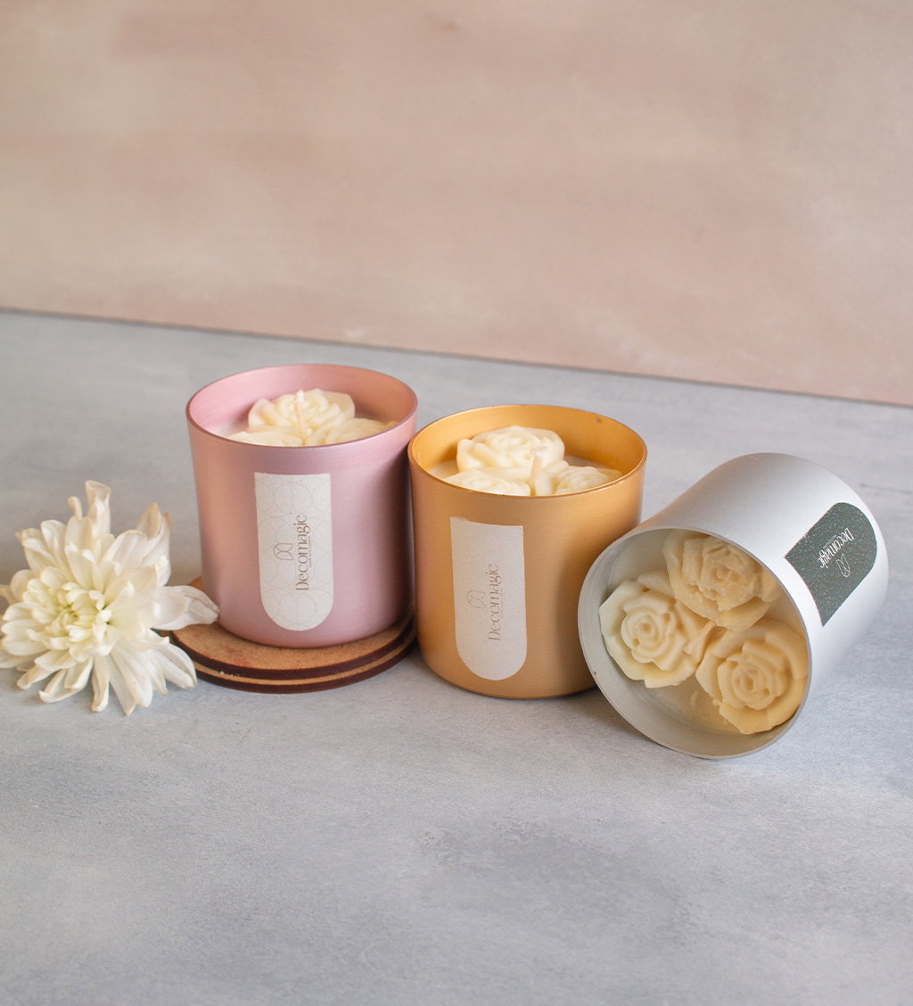Vela aromática de cera de soja 100% natural, vertida a mano con decoración de 3 rositas en 3D.