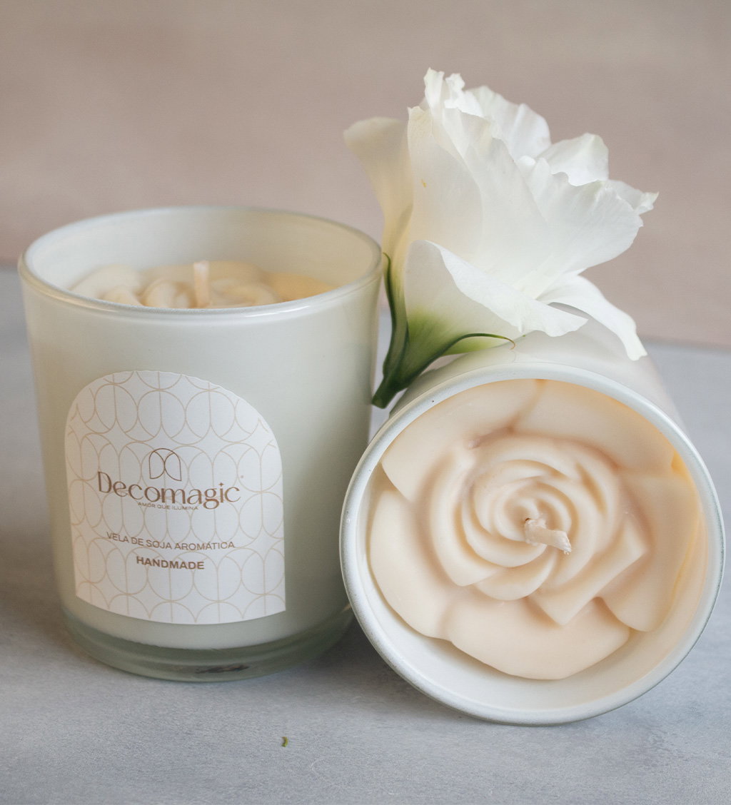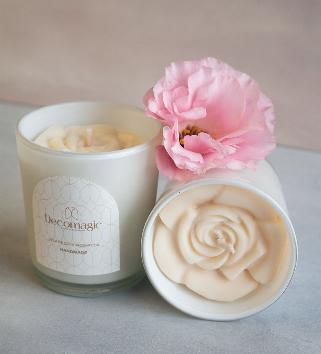 Vela aromática de cera de soja 100% natural, vertida a mano con decoración de una flor en 3D.