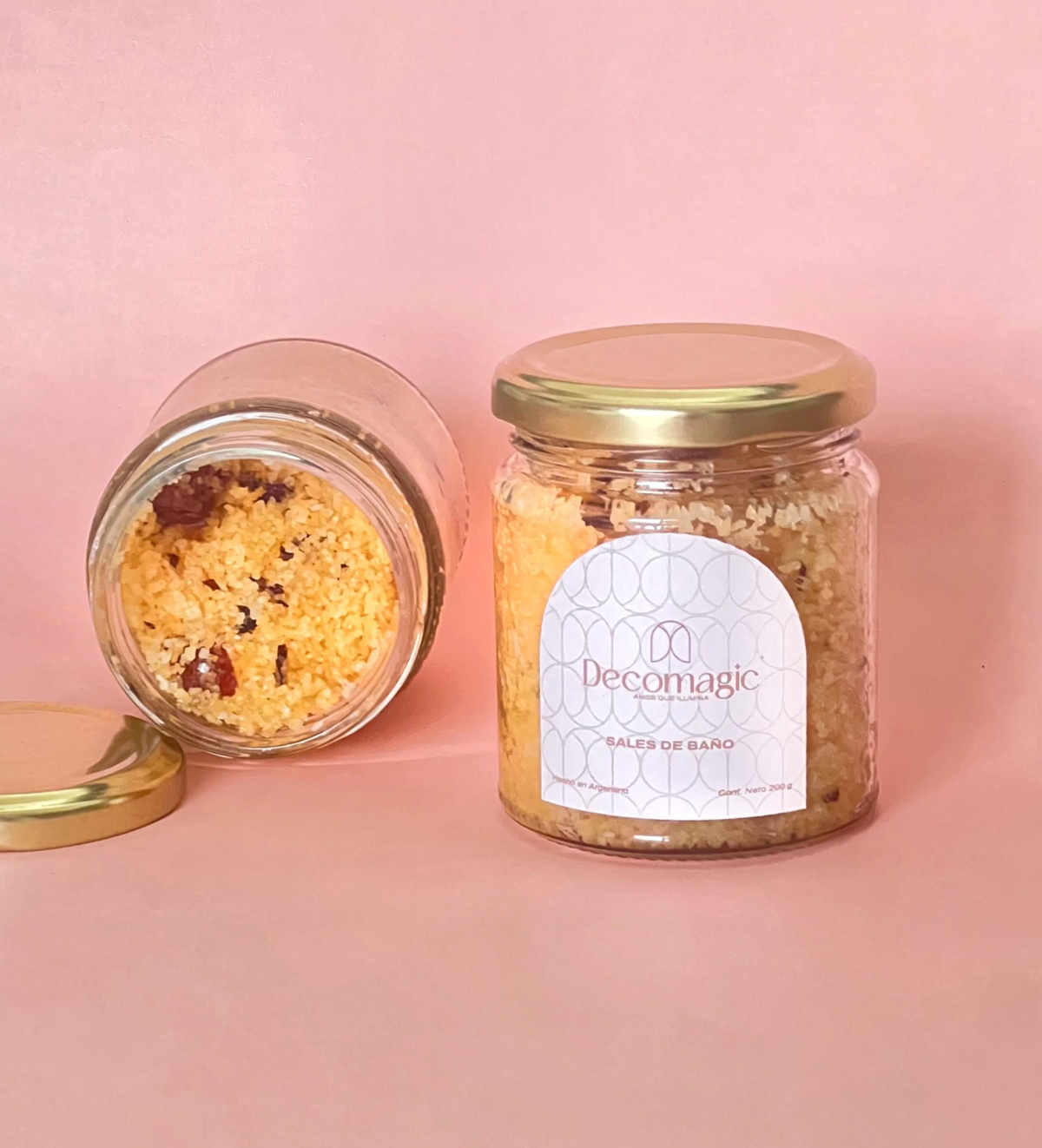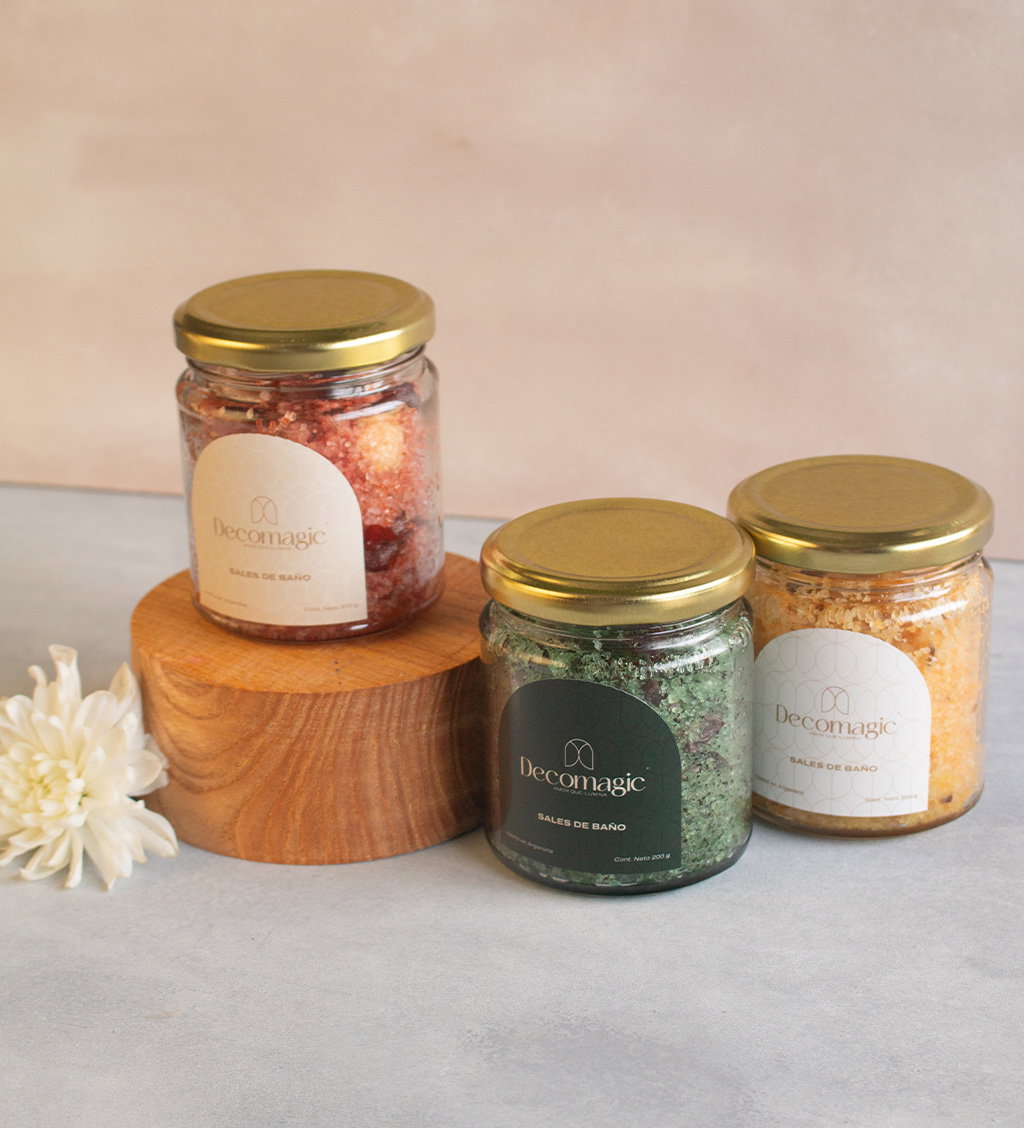 Ingredientes: Sal entrefina, sales de epson, aceites hidratantes, bicarbonato de sodio, esencia aromatica, flores o hierbas.