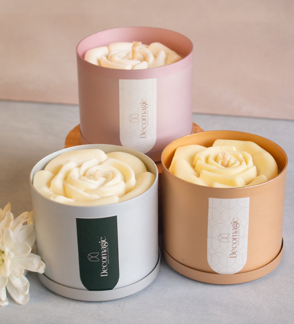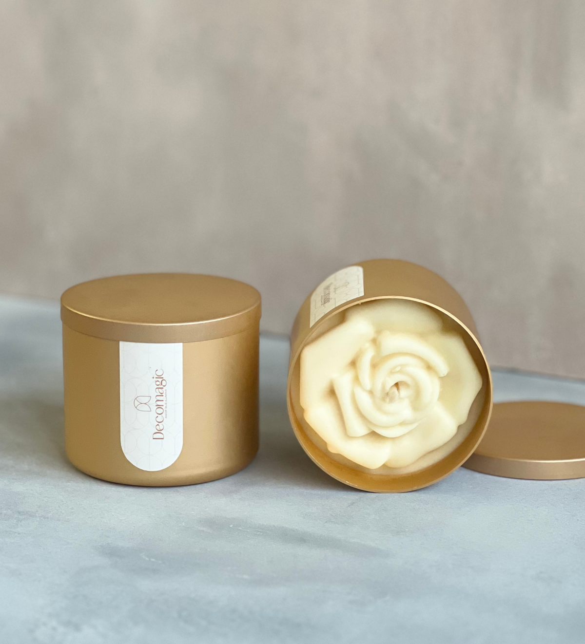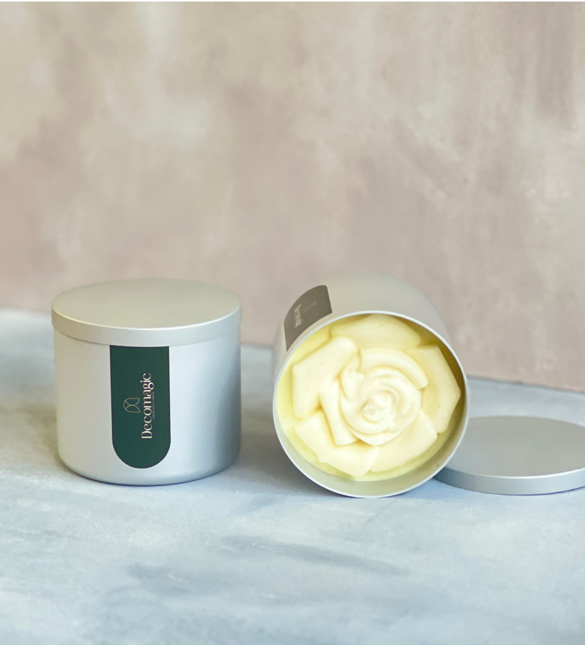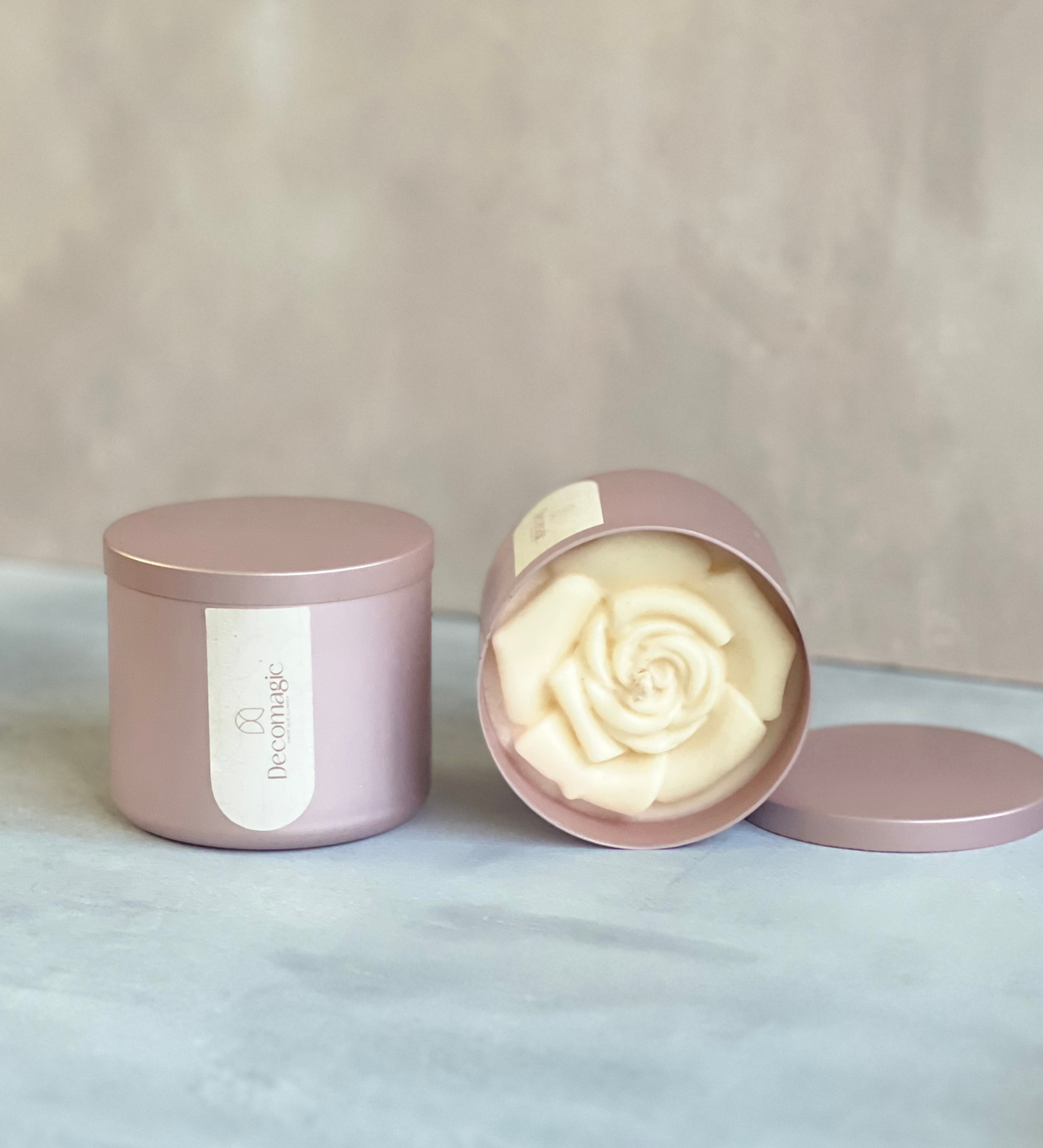 Vela aromática de cera de soja 100% natural, vertida a mano con decoración de una flor en 3D.