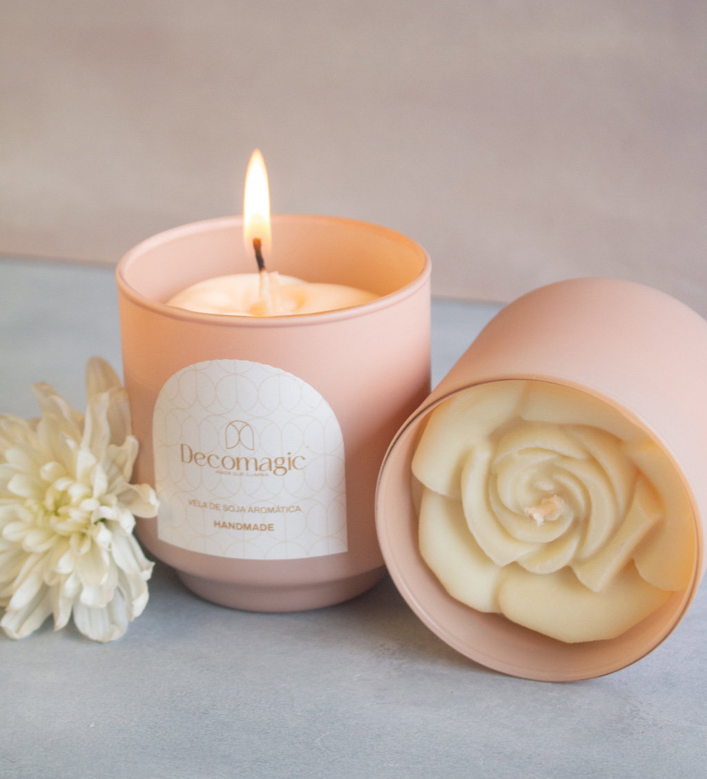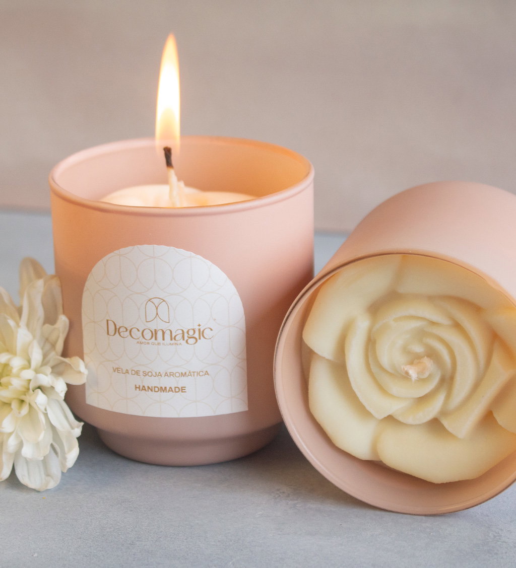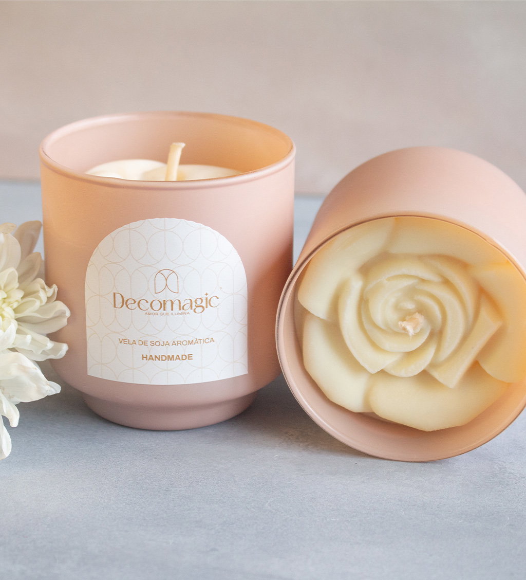 Vela aromática de cera de soja 100% natural, vertida a mano con decoración de una flor en 3D.