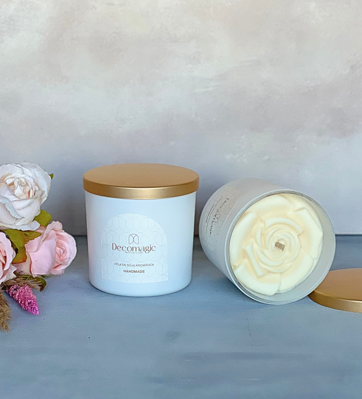 Vela aromática de cera de soja 100% natural, vertida a mano con decoración de flor en 3D.